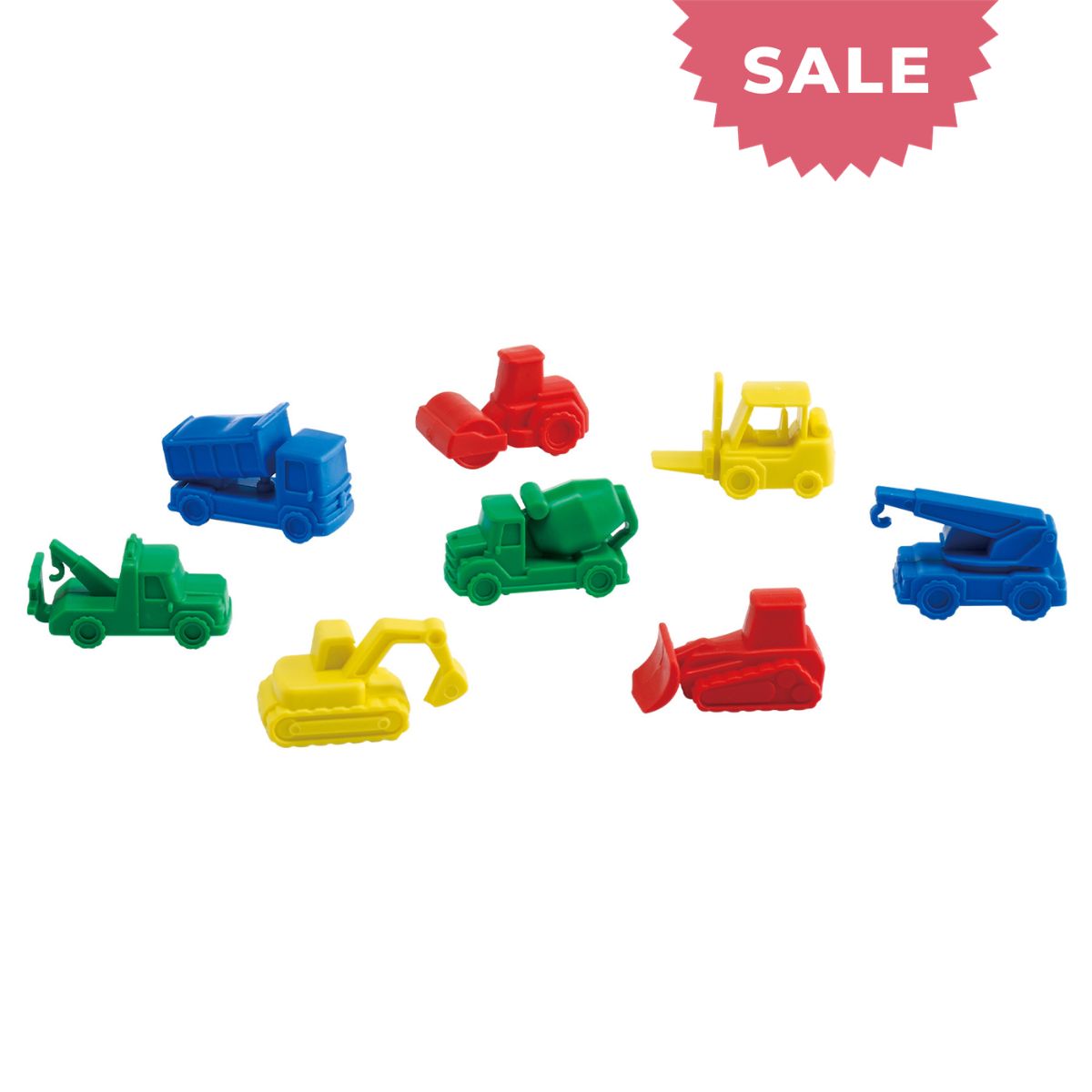 8 different shapes - bulldozer, cement truck, crane, digger, dump truck, forklift, steam roller and tow truck. The construction counters can be used in sorting activities, classifying tasks which aid logic and reasoning, and can be used in messy or small world play. Packaged in a storage jar with carry handle, perfect as a gift or to take to a play date!
