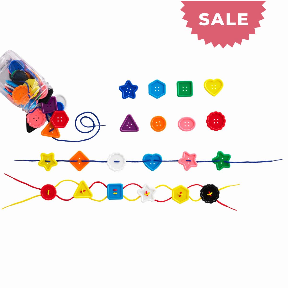 Our Edx Large Buttons 250g Jar & 4 laces set is a tactile and engaging way for children to develop their fine motor skills as they practice threading the laces through the button holes to create their own colourful patterns.